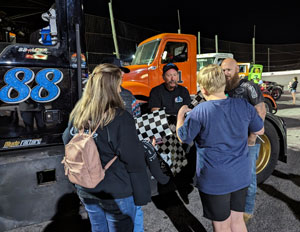 As the trucks came out on the track, Chris Kikelhan in the #01 paused between turns one and two showing a new side panel that read "Leaha will you marry me?" Leaha was in the infield taking photos and at first wondered what was wrong, why had Chris stopped? She said "yes".